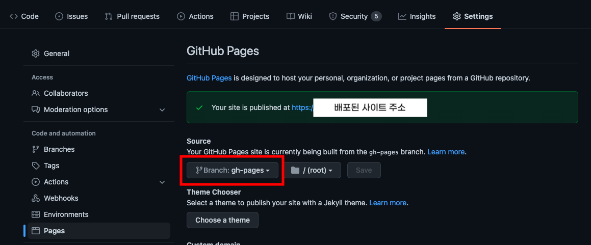 하지만 한번 확인을 해보고 싶다면 Settings > Pages로 들어가서 Branch가 gh-pages로 되어 있는지 보면 됨.