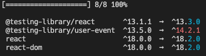 여기까지 하면 package.json 파일만 변경한 것이기 때문에 npm install 명령어를 통해 새로운 버전의 패키지를 설치해야 업데이트가 적용된다!
