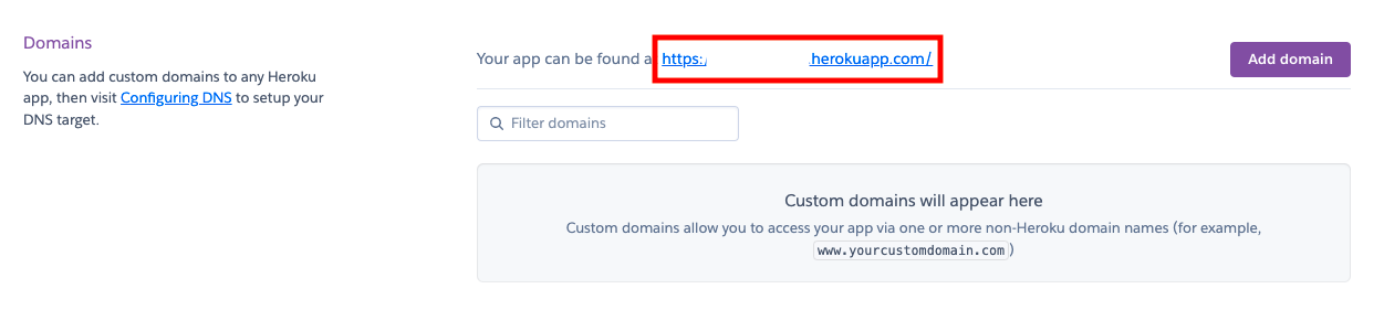 그리고 아래로 스크롤 하다보면 배포된 app의 Domain 주소를 볼 수 있다.