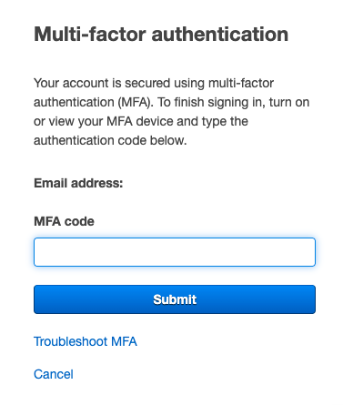 설정 완료한 이후 부터는 Root 계정으로 로그인할 때마다 다음과 같이 MFA 코드를 입력하라는 창이 뜬다.