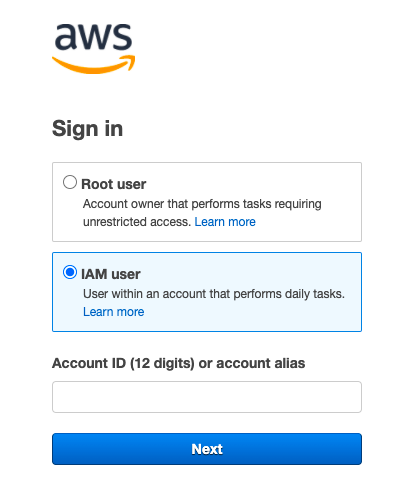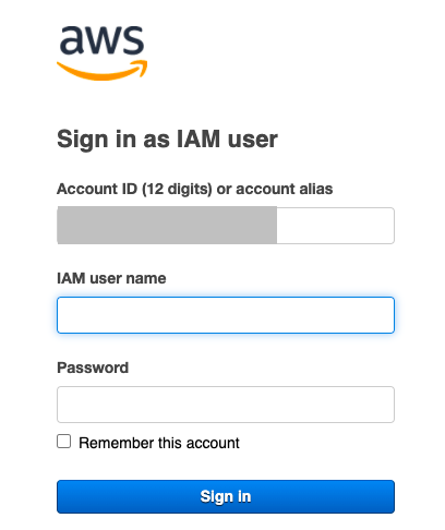 AWS 콘솔 로그인 창에서 Root 사용자 대신 IAM 사용자를 선택하고, 계정 ID를 직접 입력해주면 위와 같은 로그인 창이 뜸.