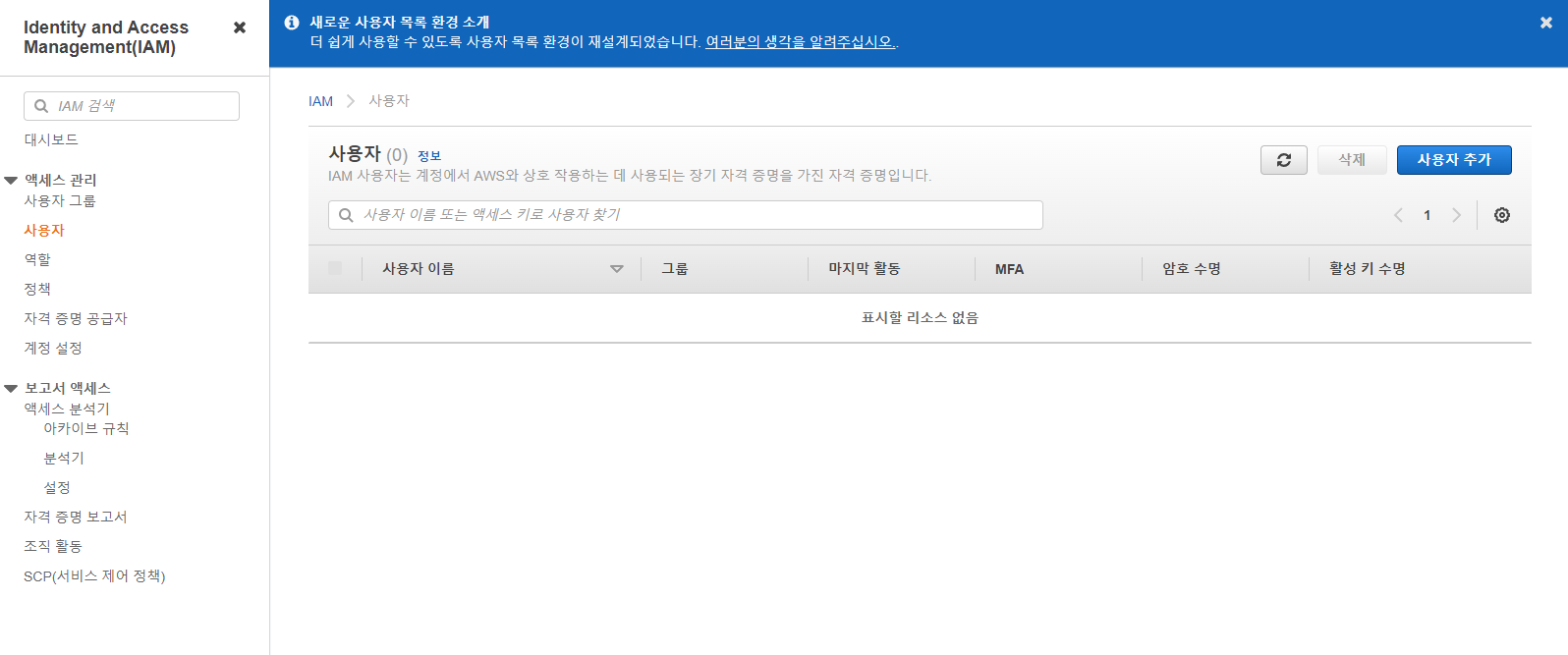 1. (MFA를 추가하지 않았다면) AWS 콘솔에 로그인 후, 검색창에서 IAM을 검색하고 들어가보면 다음과 같이 뜬다.