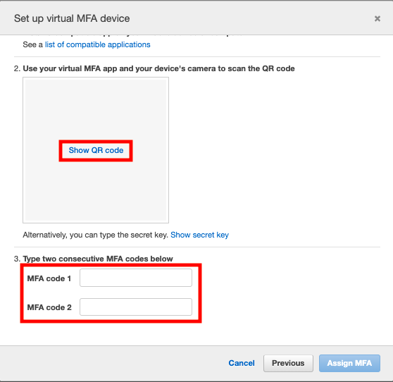 5. 가상 MFA 디바이스 설정 2번에 있는 QR 코드 보기를 클릭하면 QR 코드가 생성됨.