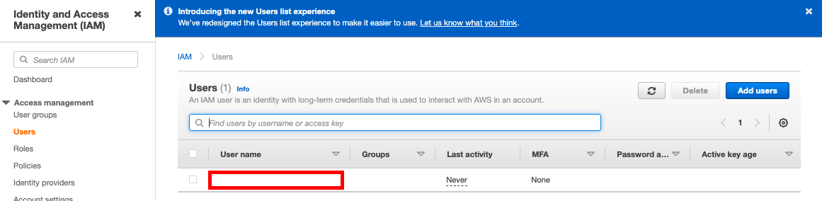 만약 이 URL 주소를 다시 보고 싶다면, 사용자 탭으로 들어가서 방금전에 생성한 user name을 클릭해주고