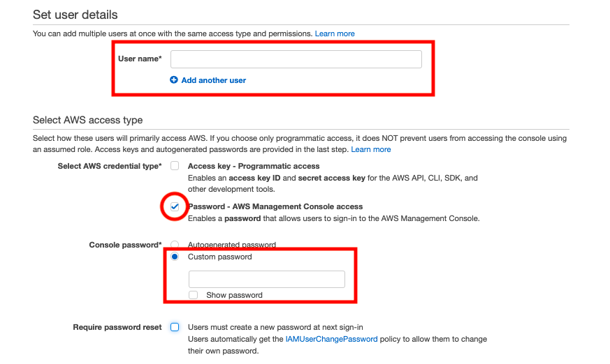 2. 사용자 이름(AWS에 로그인할 때 사용할 이름)을 입력하고, 커스텀 패스워드를 설정해준다.