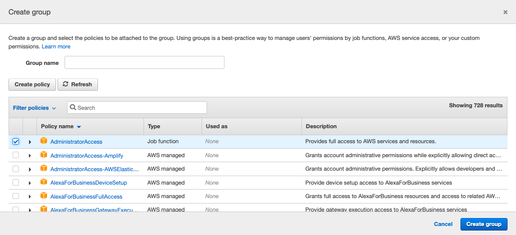 그룹 이름을 입력하고, 나는 관리자 권한을 부여하는 ‘AdministratorAccess’에만 체크를 해줬다.