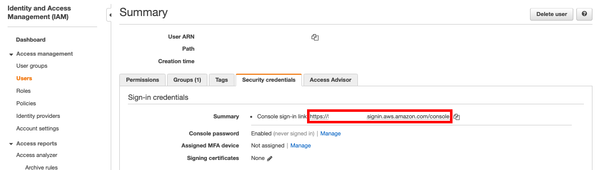 Security credentials 탭으로 들어가보면 로그인 URL을 확인할 수 있다.