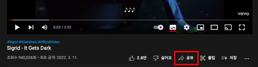 YouTube 동영상 아래의 공유 버튼을 클릭한다.