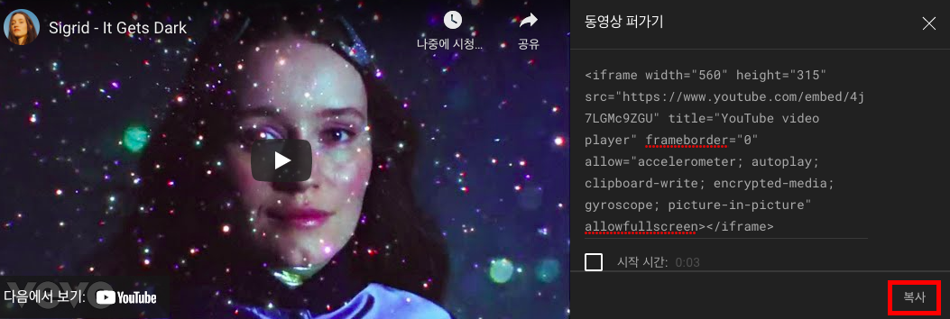 그러면 동영상 퍼가기 창이 뜨는데, 원하는 조건을 선택한 다음에 복사 버튼을 클릭하면 <iframe> 태그 전체가 복사 된다.